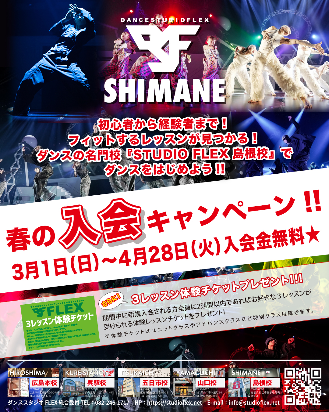 ダンススタジオFLEX春の入会キャンペーン 2026年3月1日 コメントはまだありません ダンススタジオFLEX春の入会キャンペーン!!期間:2026年3月1日(日)~4月28日(火) この春、ダンスにチャレンジ★広島・呉・五日市・山口・島根の5校ダンスの名門校「STUDIO FLEX」でダンスをはじめよう!